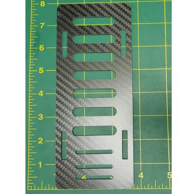 Black Carbon-fiber battery tray. 1 tray per package. This is lighter and stronger than the similarly sized/styled black fiberglass trays seen on the market. Picture 3 shows the item mounted in a Deep Vee-style boat for reference only. These trays can be mounted edge-to-edge, like in the picture. Or can be mounted in a flat area with the included tabs to lift the battery 3.5mm off the hull floor. These fit packs up to 200mm x 55mm.