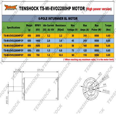 Evo TS-MI-EVO2280-HP High Power version : 40x109.5mm : 6 Pole Motor.-See picture 2 for motor chart1. Powerful 6-pole core design for high torque output.2. Advanced assembly technology enables more efficient space utilization.3. CNC-machined aluminum casing4. 5. Silver and copper wire alloy for super high efficiency over a basic copper alloy wire. 5. Powerful sintered neodymium magnets6. High torque-to-weight ratio.7. The hand-wound weaving of the winding ensures the motor has excellent electrical characteristics! 8. Includes a free water jacket with an internal water channel to ensure water flows around the motor 9. High-grade bearingsSpecs:Magnets: neodymiumWatts: 9,500Poles: 6Motor Shaft: 8mmShaft Length: 21.5mmCan Measures: 40mm diameter x 109.5mm longWeight: 650GramsMounting Screw diameter required: 4mmBearing size: (front), (rear)Connectors: mm Water Jacket: mm longOSE suggests 30,000-40,000 total rpm. These are only guidelines, we suggest if you don't know how to pick the correct motor, please consult OSE first or other members of the RC Fast electric boating community, either at a local club or on our OSE Forums. * It is important to note that the "Max Amps" value represents the maximum recommended operating current for the motor. It does not indicate the maximum current the motor can draw. For instance, the 1400kv motor has a "Max Amp" rating of 210. This means the motor should not be operated at a current exceeding 210 amps. However, this does not imply that a 200 amp ESC will be compatible with the motor. Instead, the user must select a propeller or gearing that prevents the motor from exceeding its "Max Amp" rating. It is important to note that the 210 amp motor can and will exceed the 210 amp range when pushed beyond its limits, for a short period of time.